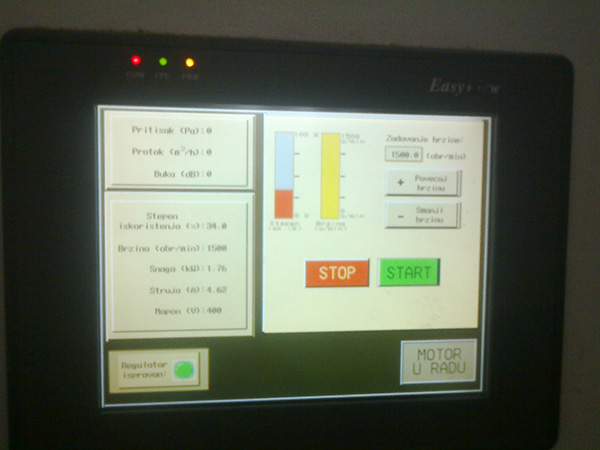 Ispitna stanica ventilatora je opremljena kompjuterizovanim frekventnim regulatorom “Emerson” na kojem se prati “radna tačka” ventilatora. Očitavanjem parametara, broja obrtaja, statičkog pritiska i protoka, očitavamo i Pef-efektivnu snagu elektromotora i (η) koeficijent iskorišćenja ventilatora.