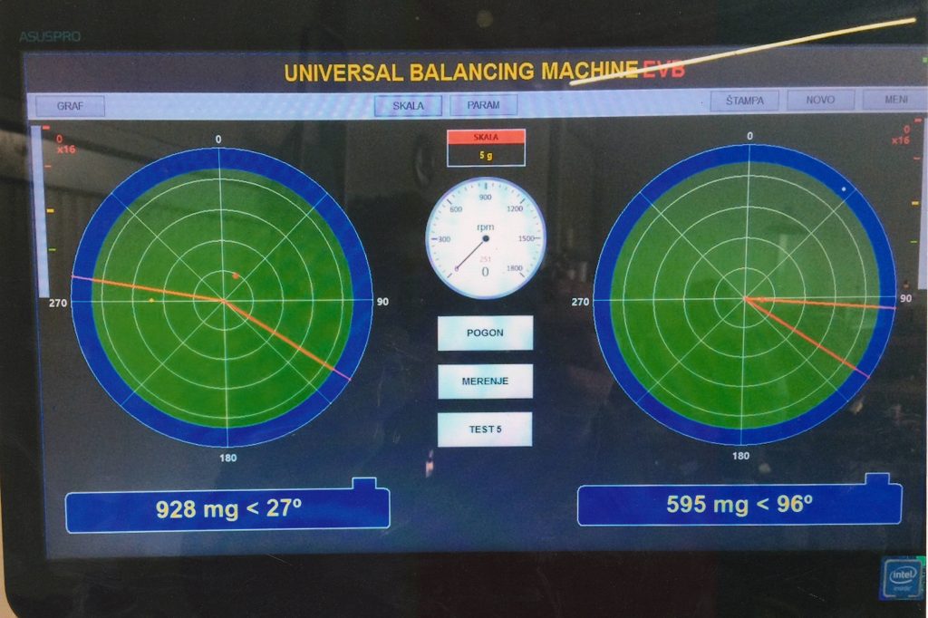 Svaki ventilator se statistički i dinamički balansira na min. vibracije po X i Y osi u jednoj i dve korekcijske ravni (dinamičko uravnotežavanje). Podaci se unose u računar i arhiviraju se za svaki ventilator. Nakon montaže i eksploatacije ventilatora vrši se ponovno snimanje vibracija na licu mesta. Balansiranje se vrši preciznim vibro-balansom firme “Schenck” Nemačka, za daljinsko snimanje vibracija.